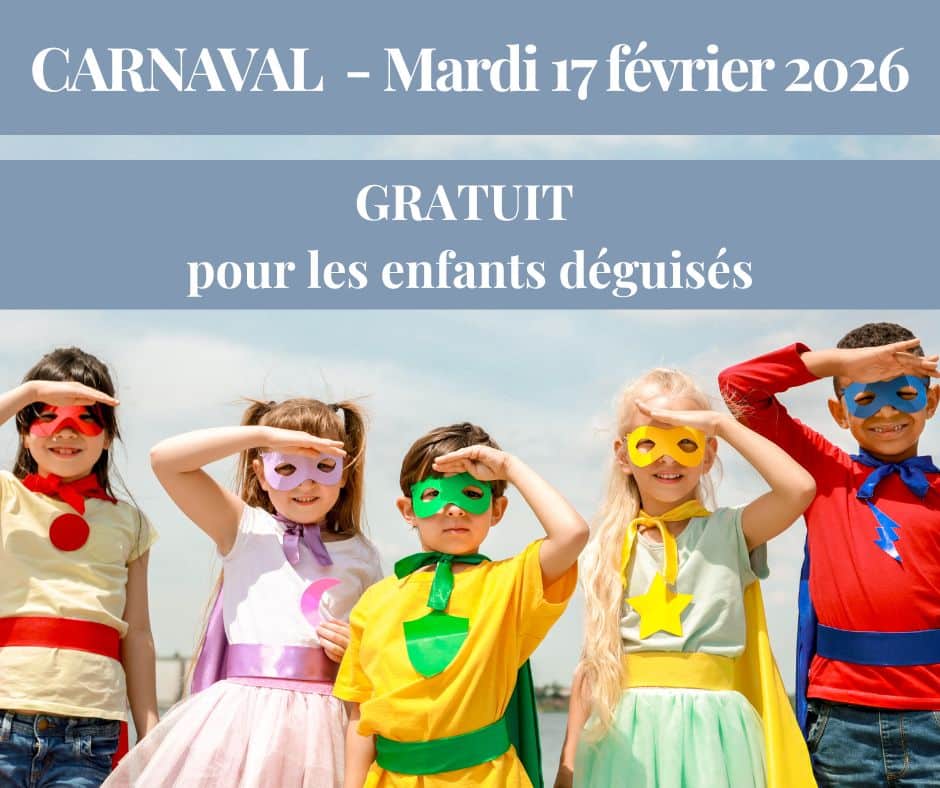 - Tarif : Entrée dans le parc gratuite le 17 fevrier 2026 pour tous les enfants (3/12ans) déguisés de la tête aux pieds. Offre réservée aux familles. Hors groupes.